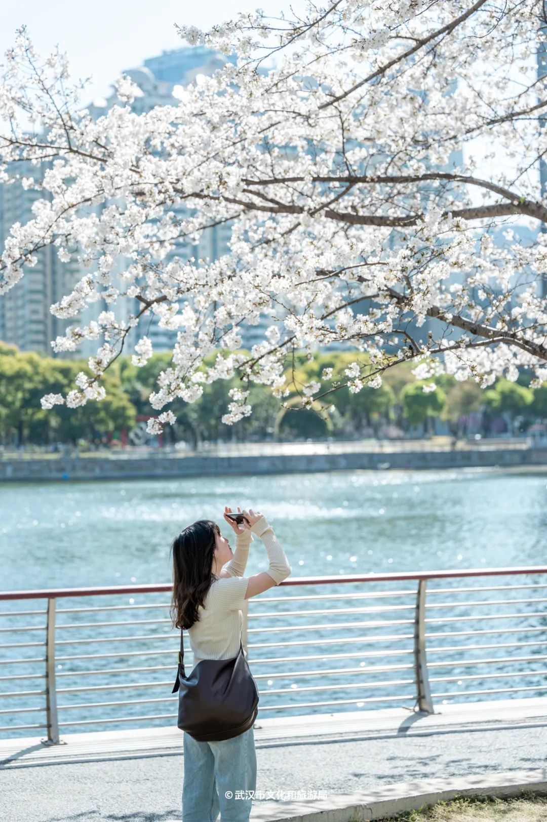 汉口江滩可看到樱花与江景同框的风景。从天津路闸口进入江滩公园,就能看到成片樱花林。三阳门附近的一期樱园,占地面积约一万平方米,有200余株樱花树,花期从3月持续到4月。