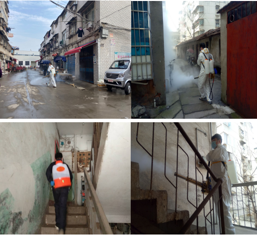 在穿戴好口罩、防护服、手套等防护装备后,8名消毒人员背着4台消杀专用高温高压热烟雾机、4台超低容量喷雾机,深入老旧小区、集贸市场、商业街,对小区垃圾桶、小区各楼栋、下水道、绿化带等阴暗潮湿四害易滋生场重点区域进行全方位无死角喷杀消毒。