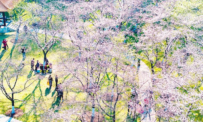 3月22日,武汉市堤角公园樱花盛开,吸引大批市民游客踏青游玩。(湖北日报全媒记者 魏铼 摄)