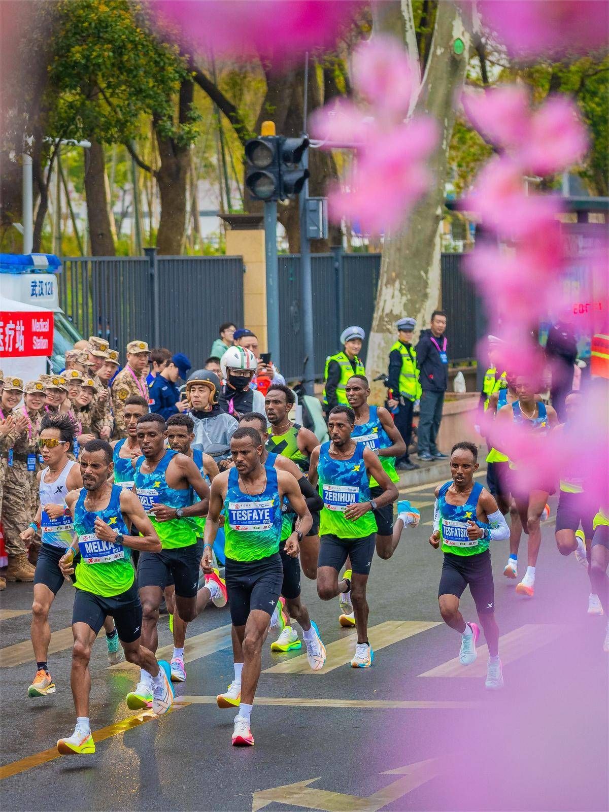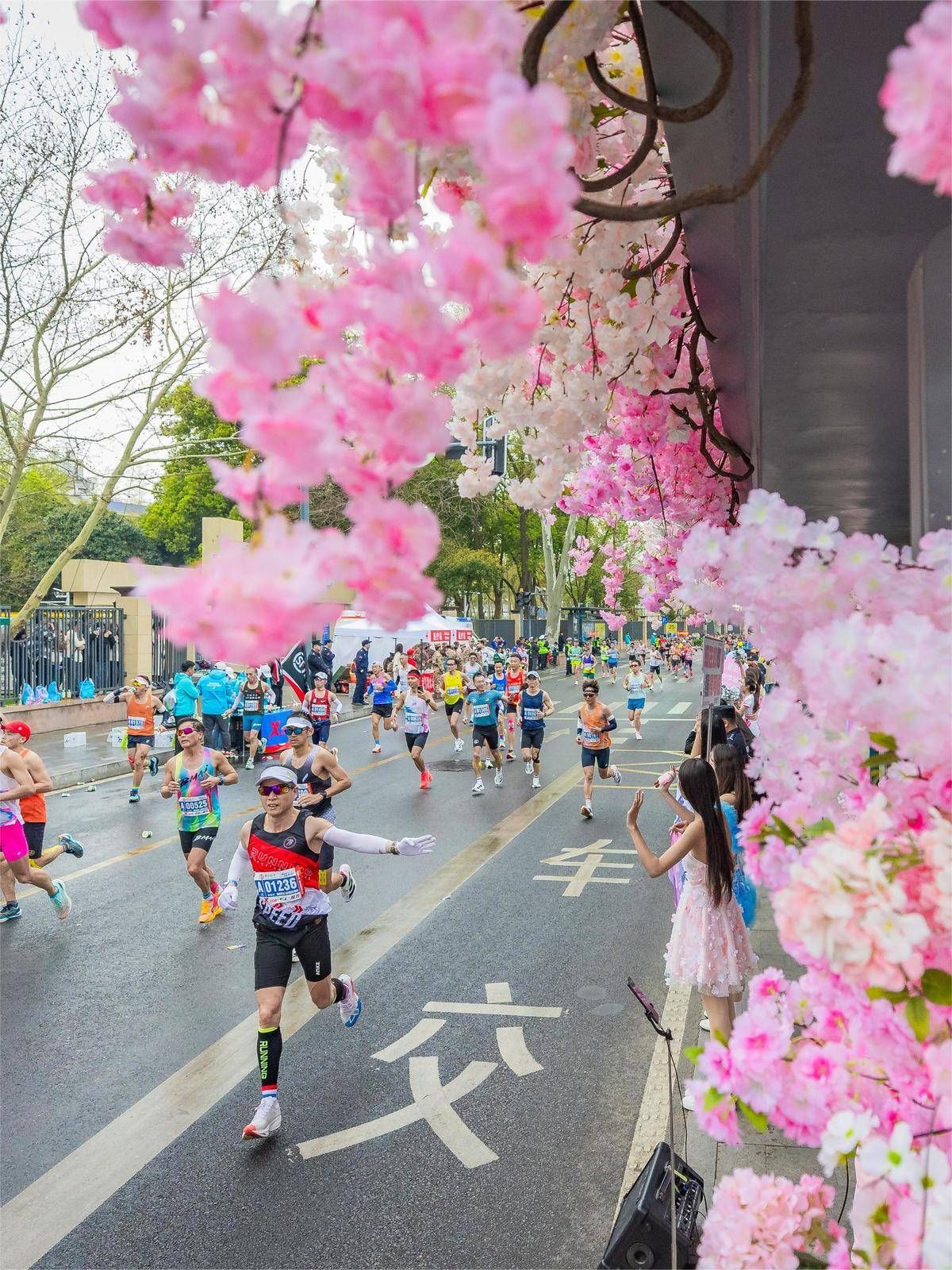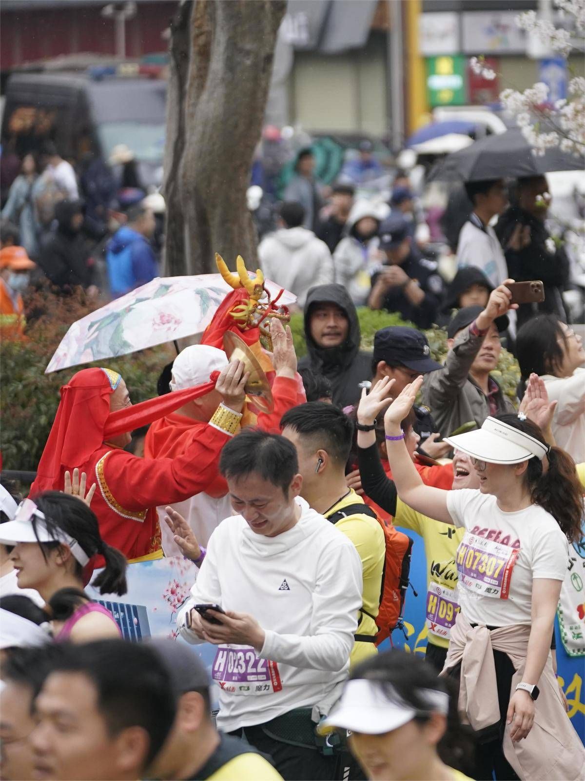 2025武汉马拉松鸣枪开跑,赛道两旁盛开的樱花和热情的武汉人民为马拉松健儿加油助威。(湖北日报全媒记者 魏铼 摄)