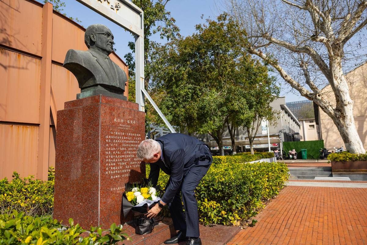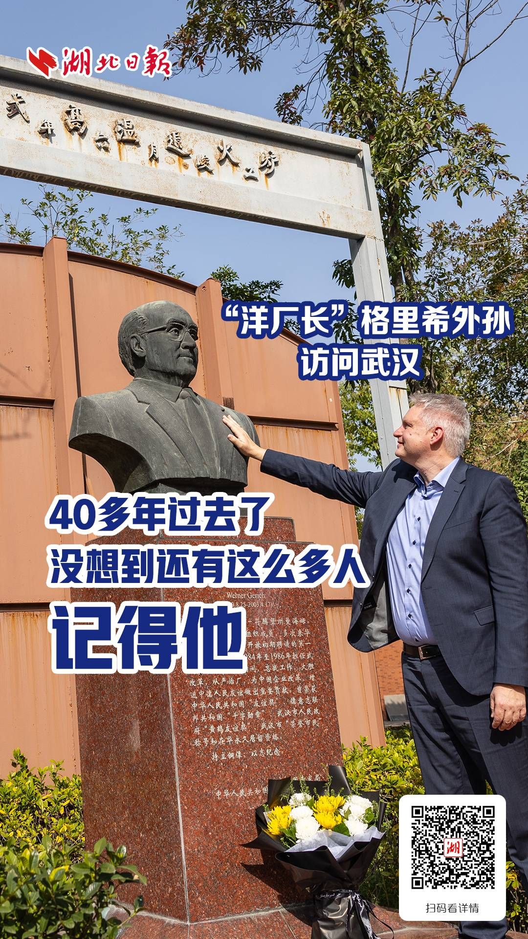 3月24日,武汉市汉正街都市工业园,拉尔夫·索伯比尔将一束鲜花轻轻放在外祖父威尔纳·格里希的铜像前,深情凝望。