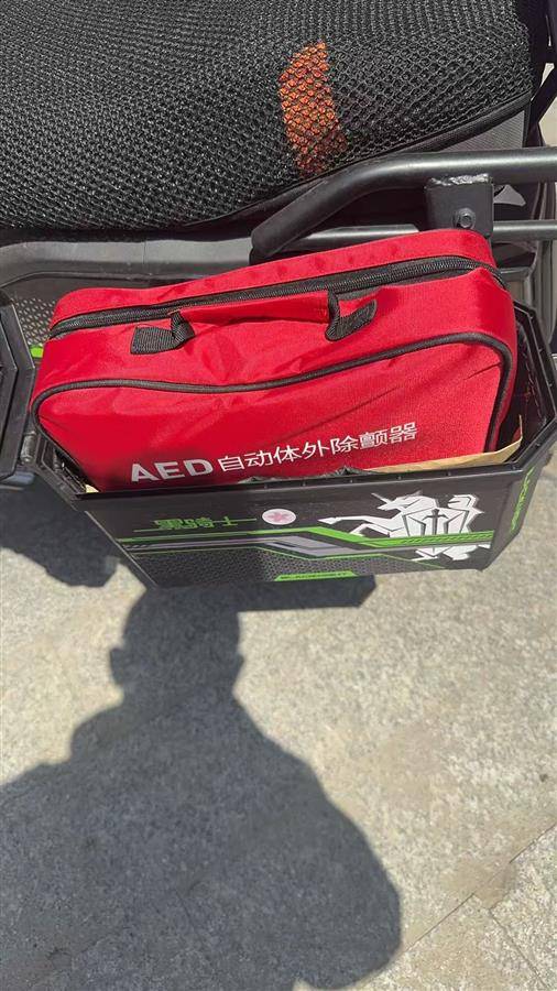 张宝剑的外卖电动车后侧随时携带AED。 (受访者供图)