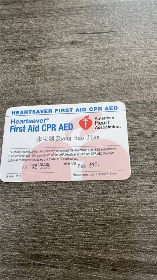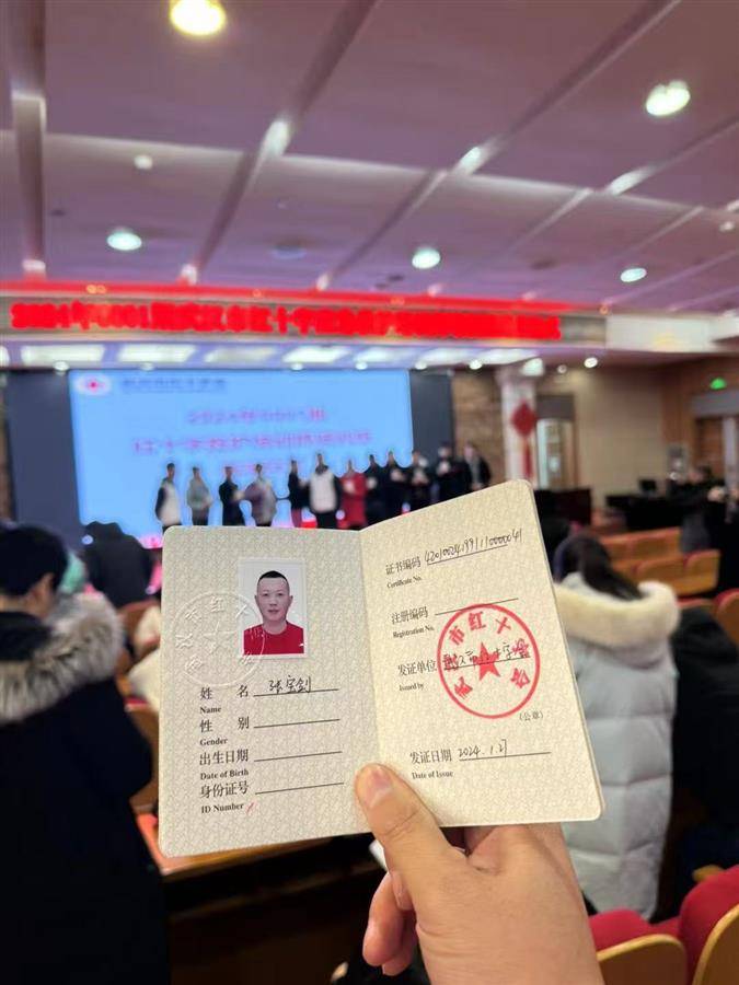 2024年,张宝剑考了红十字救护师资格证,今年初又领取了AHA国际救援证。得知张宝剑持证后,江汉区委社会工作部特意给张宝剑所在的网点送去一台AED设备。