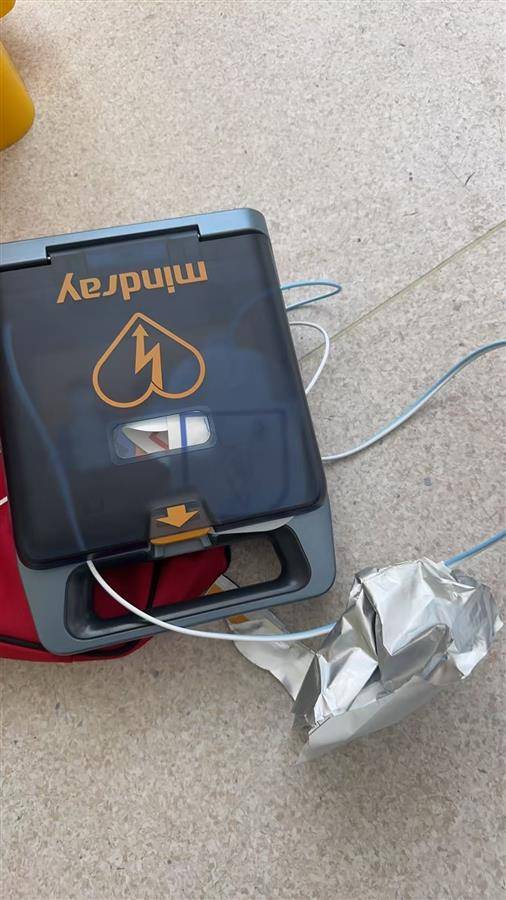 张宝剑观察发现,伤者口吐白沫,嘴角有异物。为防止异物致人窒息,他用小拇指将伤者口中异物抠出,并把AED除颤仪电极片贴在其胸口,进行抢救。