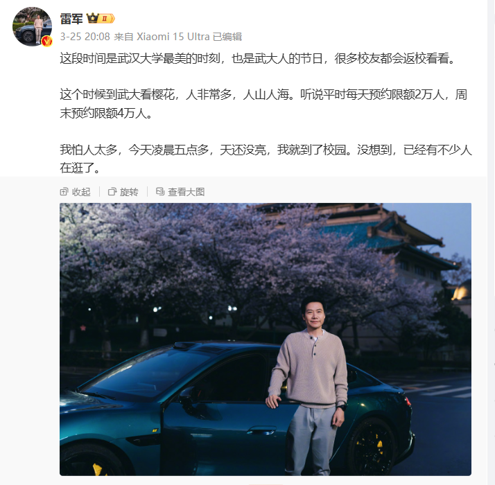 3月25日凌晨五点,当大多数人还在梦乡时,雷军已经悄悄来到了武大的樱花树下,咔嚓几张美照,直接换上了社交网站头像。他发文说:“这段时间是武汉大学最美的时刻,也是武大人的节日,很多校友都会返校看看。这个时候到武大看樱花,人非常多,我怕人太多,今天凌晨五点多,天还没亮,我就到了校园。没想到,已经有不少人在逛了。”这波操作,不仅展现了他对母校的深情,更彰显了一个湖北人的极致浪漫,这不就是“别人家的校友”嘛!