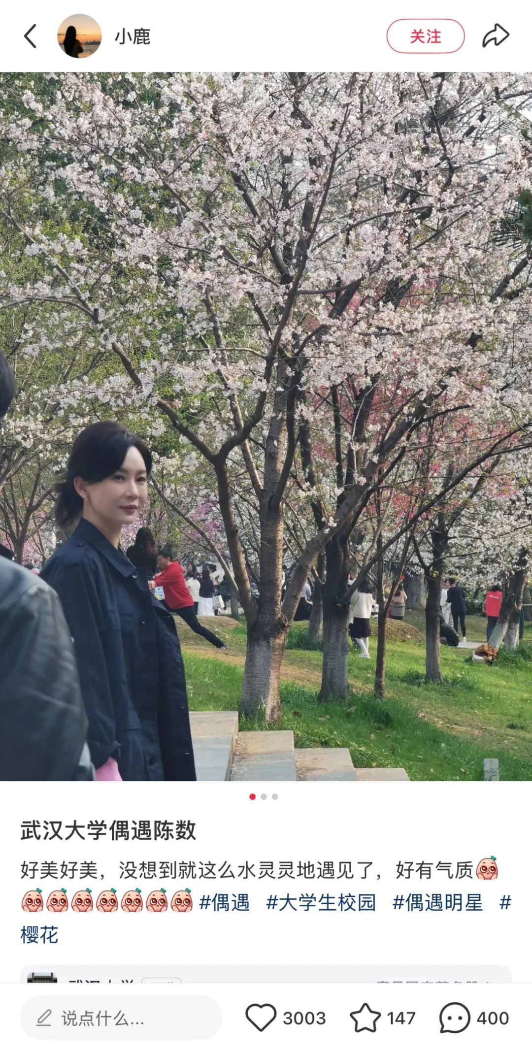 除了雷军和《奔跑吧》,演员陈数也来到了武汉。3月23日,陈数打卡西北湖绿化广场和武汉大学赏樱,被好多民众认出,她优雅的身影在樱花树下显得格外引人注目,仿佛是从文艺电影中走出的女主角。
