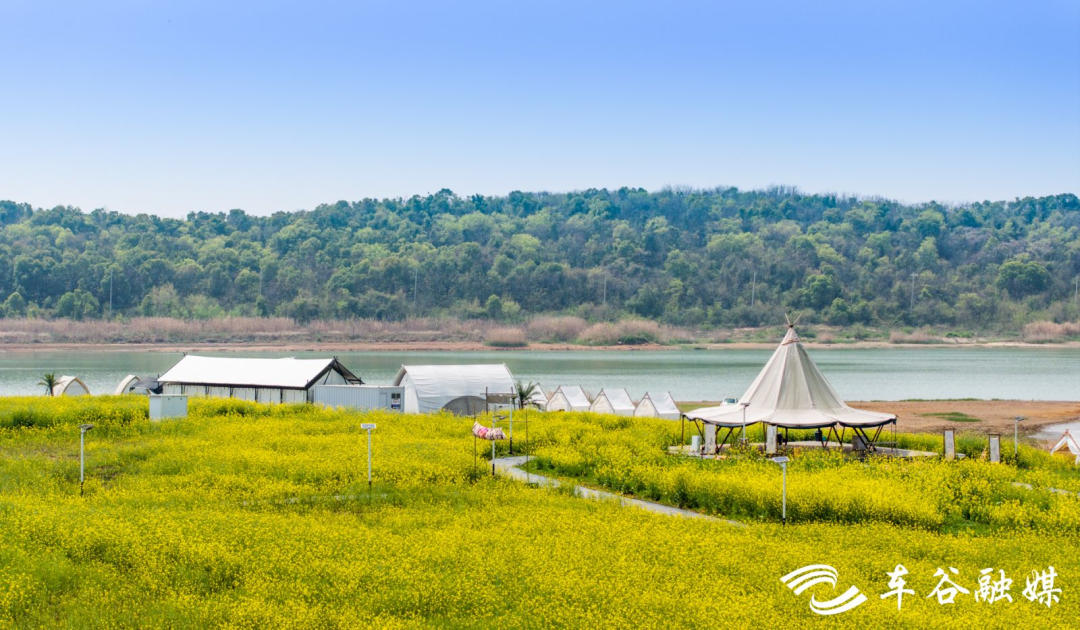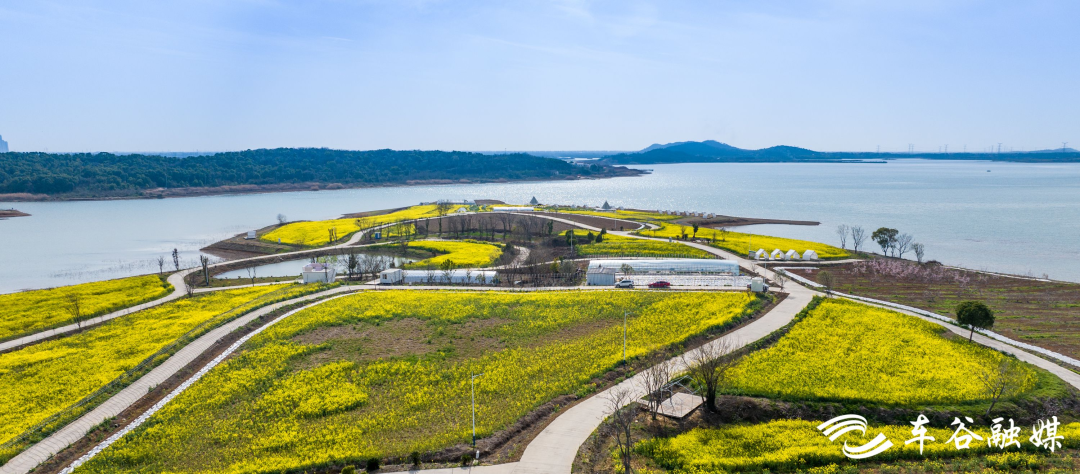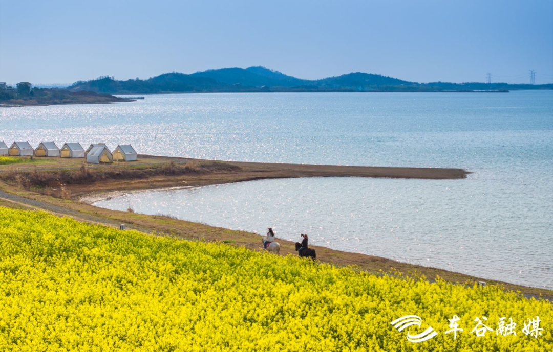 官莲湖畔,金色的油菜花田与潋滟湖光相接,蜂蝶在花丛间欢快地翩翩起舞,像是这片花海的精灵,为美景增添了几分灵动与活泼。
