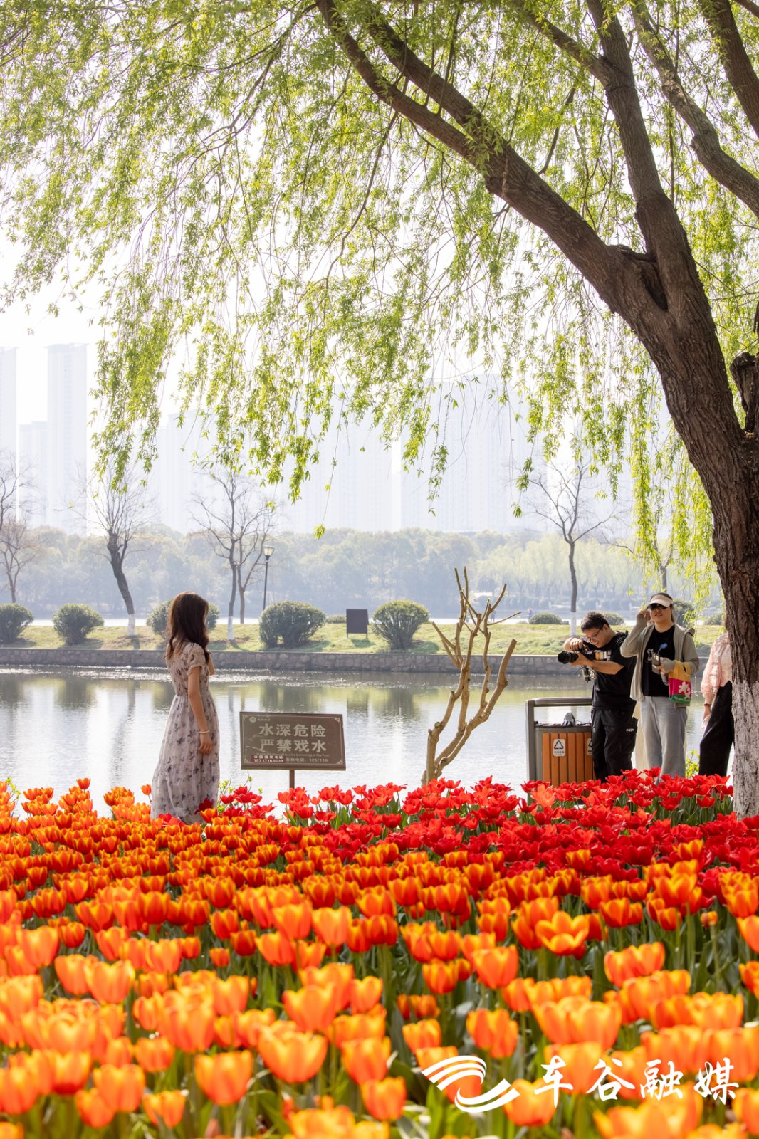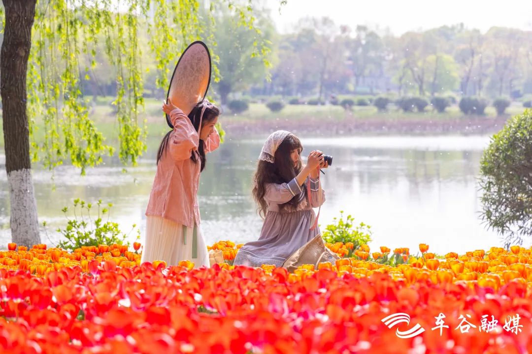 湖边,各色郁金香悄然绽放,铺满整个湖岸,走进花丛,就走进了油画般的春天。