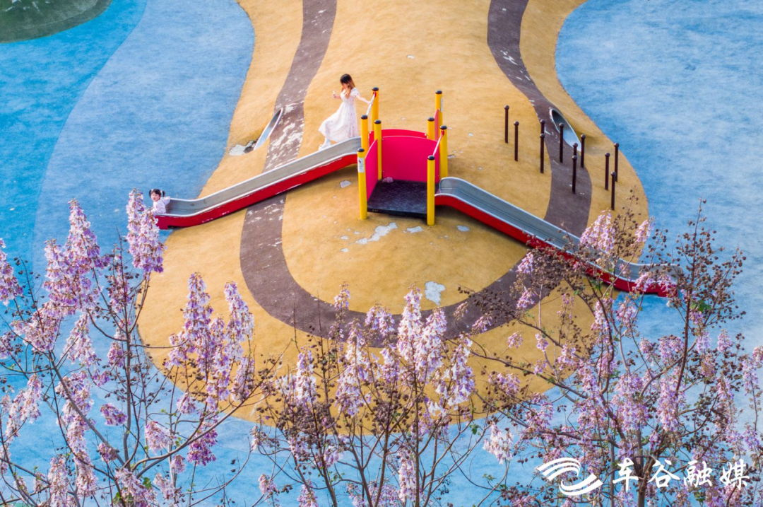设法山三国历史文化公园内,泡桐树上挂满了巨大的紫色花冠,一片片泡桐花与蓝天白云交融在一起,梦幻、浪漫,让人仿佛置身在紫色的城堡之中。