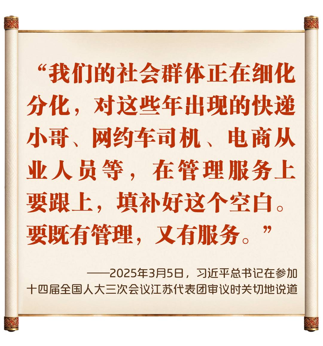 快递员是美好生活的创造者和守护者,是习近平总书记一直牵挂的群体。今年全国两会期间,总书记在参加江苏代表团审议时,关切地说道:“我们的社会群体正在细化分化,对这些年出现的快递小哥、网约车司机、电商从业人员等,在管理服务上要跟上,填补好这个空白。要既有管理,又有服务。”一份关切,始终如一。