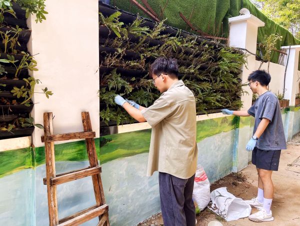 此前,锦程公寓小区存在墙面脏乱、绿化不足等问题。为此,江汉大学环康学院将研发的“轻质陶粒生态种植技术”,创新打造“可呼吸、会生长”的立体绿化墙。从最初的一纸计划,到实地调研,再到施工打造,利用陶粒多孔透气的特性,搭配自动化滴灌系统,成功在垂直墙面上种植凌霄花、常春藤等耐旱绿植,形成“四季常青”的“绿水青山生态景观墙”。这是社校共建以来,高校科研成果转化为民生工程的一次生动实践。