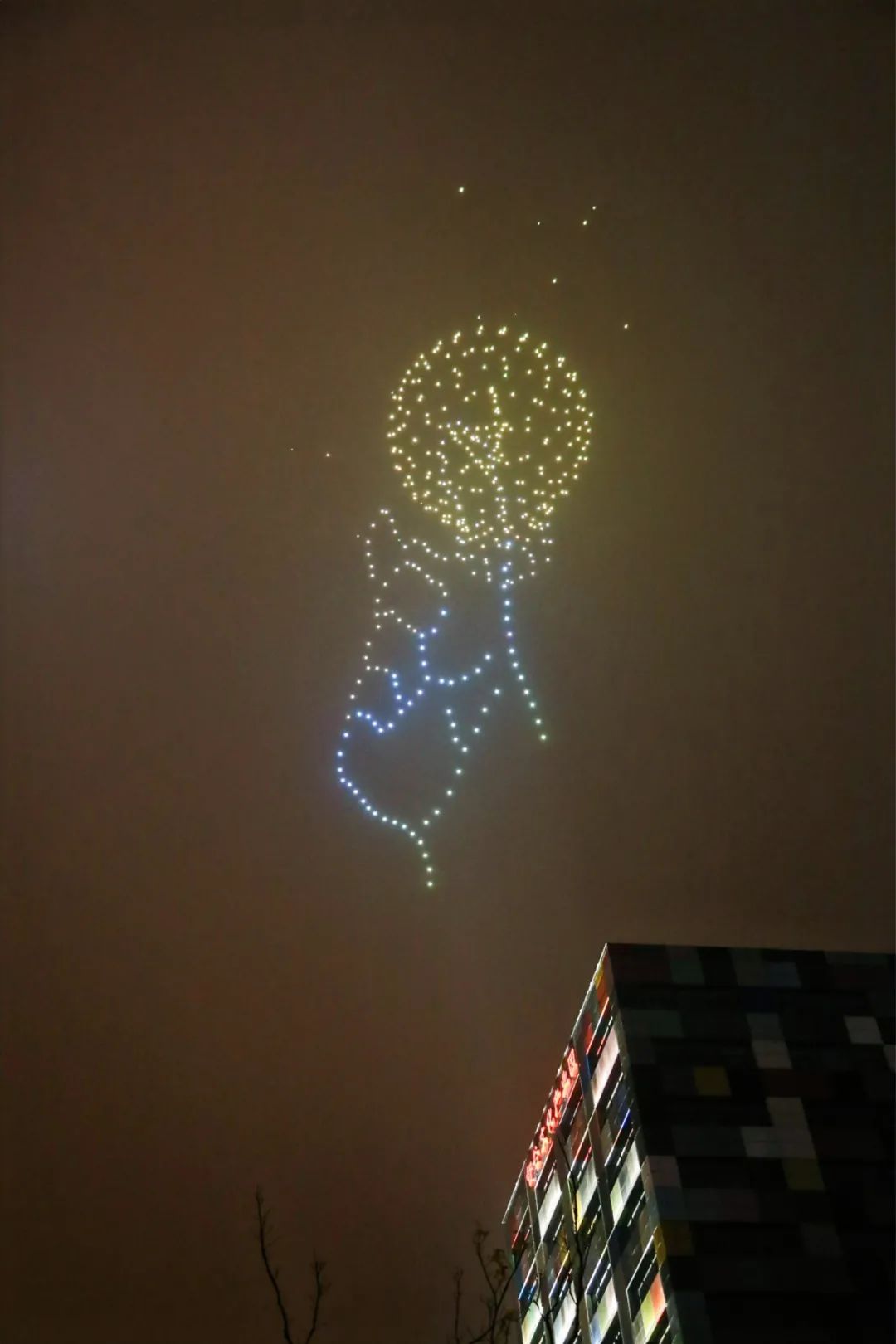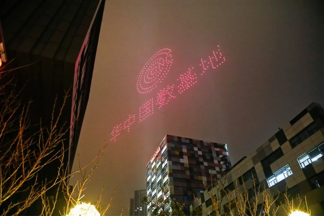 夜幕降临后,多架无人机同时腾空而起,瞬间点亮夜空。