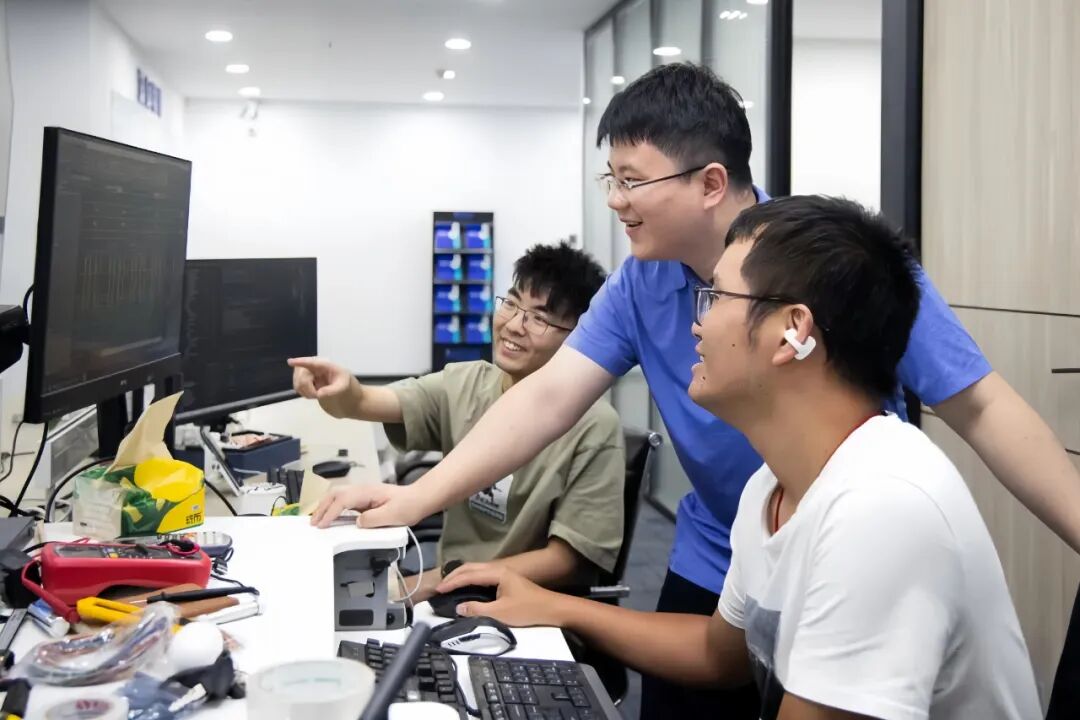 ▲魏蓝天(中)和团队一起探讨技术。