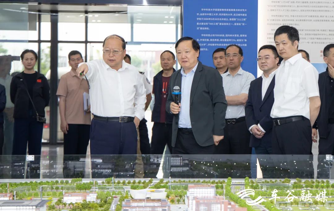 调研中,刘子清、解孝林、唐超前往华科大军山校区城市展厅、华科大军山校区教职工配套房地产等项目建设现场,详细了解学校试运行情况及校区周边配套项目建设进展。