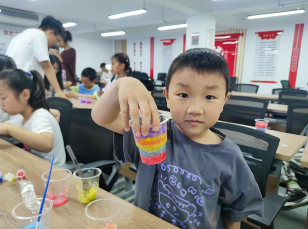 在令人期待的树脂彩虹DIY制作环节,志愿者们将准备好的杯子、水、颜料等工具一一发放到小朋友们手中,并耐心讲解制作步骤和注意事项。在老师的指导下,小朋友们小心翼翼地将各种颜料与水混合。接着,加入树脂材料搅拌,树脂材料与水充分混合膨胀,再根据自己的喜好在第三个杯中不断叠加堆积。不一会儿,一个个彩虹做成了。“快看,我的杯子里装着一个彩虹!”小朋友们兴奋地拍手叫好,纷纷展示自己的作品,现场充满了欢声笑语。