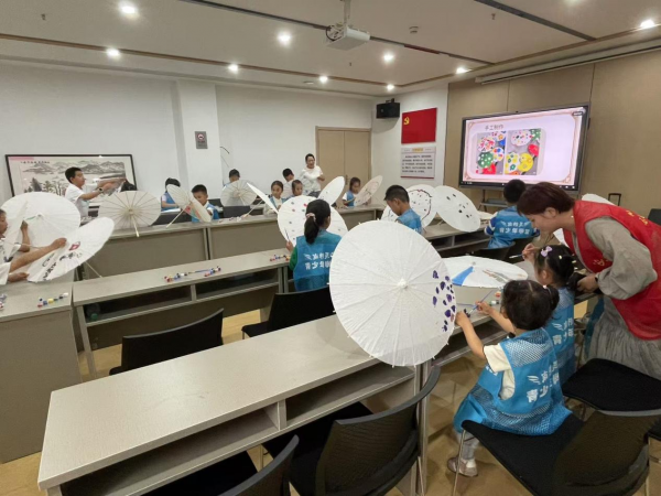 了解完油纸伞的制作,“小画家”们开始动手实践。在志愿者指导下,他们调色、构图,将小动物、树叶、花朵、白云等图案画在伞面上。孩子们相互欣赏作品,分享创意,现场充满欢声笑语。