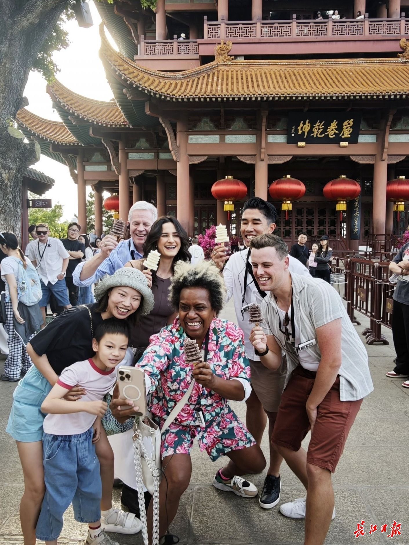 外国游客手握黄鹤楼文创雪糕合影。记者何晓刚 摄