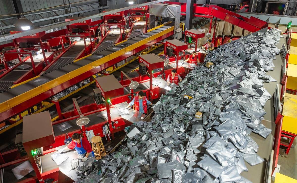 极兔速递天门分公司全自动快递分拣线火力全开,每天20多万件服装发往全国各地。(湖北日报全媒记者 柯皓 通讯员 许磊 摄)