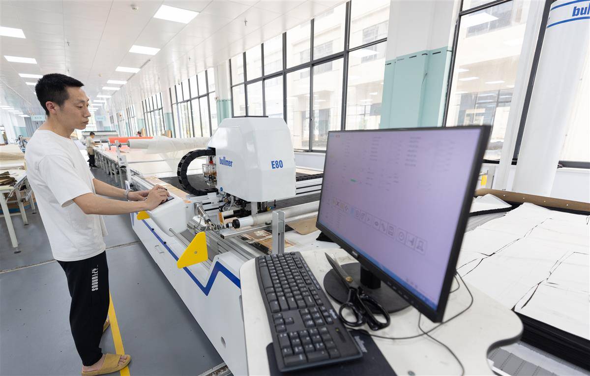 天门悦姿服饰有限公司生产车间,工人在调整自动裁片机参数。(湖北日报全媒记者 柯皓 通讯员 许磊 摄)
