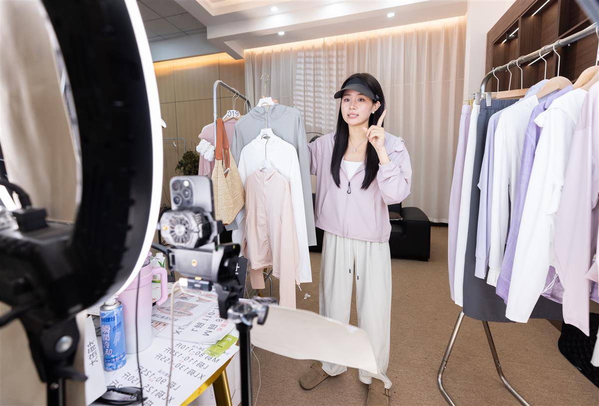 天门通天传媒公司直播间,主播忙着推荐防晒衣。(湖北日报全媒记者 柯皓 通讯员 许磊 摄)