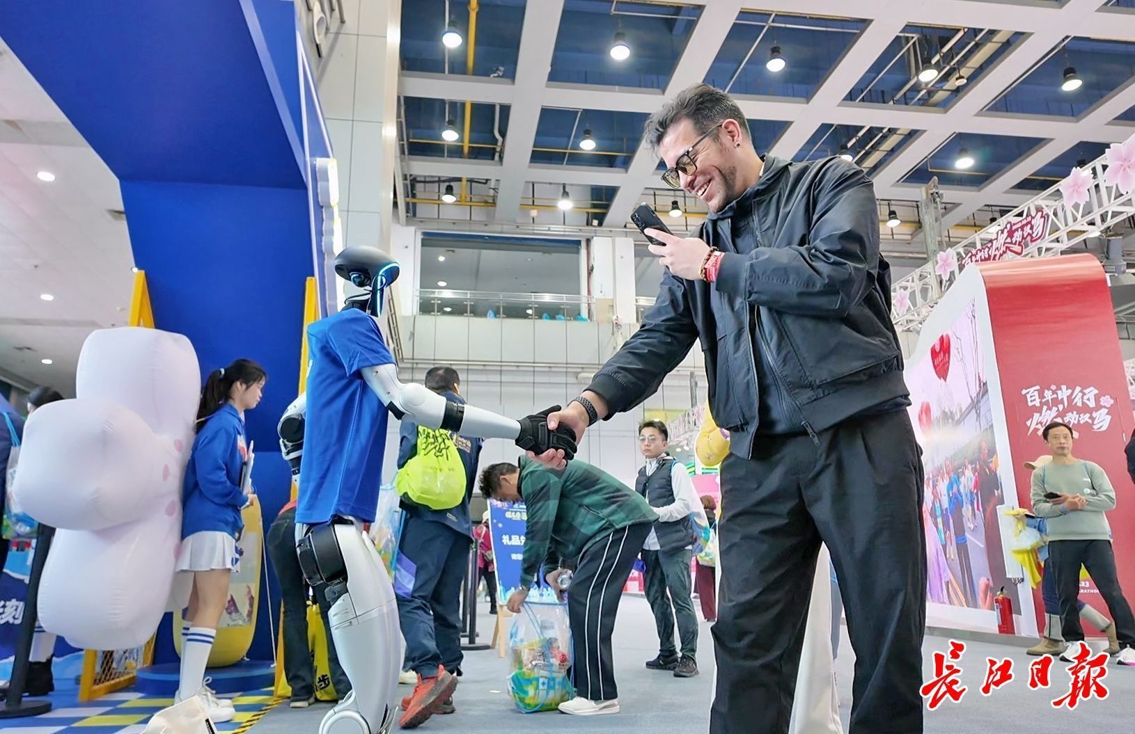 3月20日,汉马选手则与人形机器人互动拍照。 委内瑞拉选手吴瑞龙与人形机器人志愿者握手。苗剑 摄