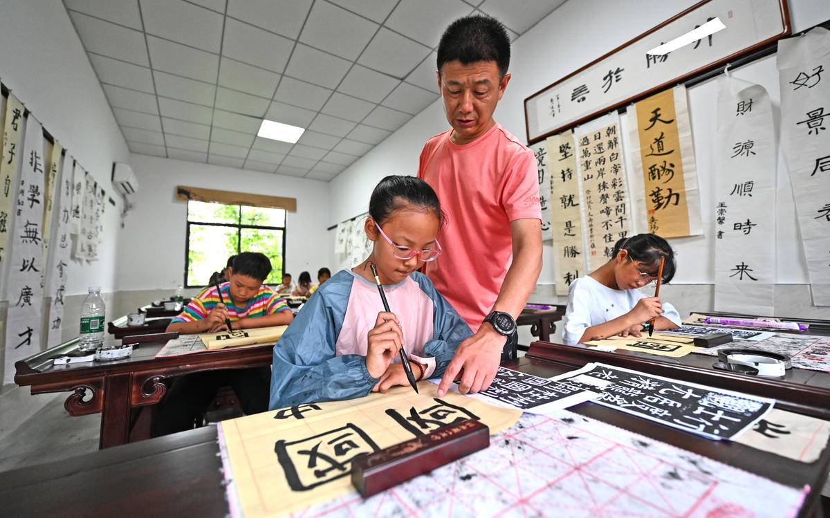 2024年7月10日,荆州市荆州区八岭山镇新湾村新时代文明实践站热闹非凡,村里的孩子走进乡村“书法大讲堂”,开始别样的暑假生活。(湖北日报全媒记者 刘曙松 摄)