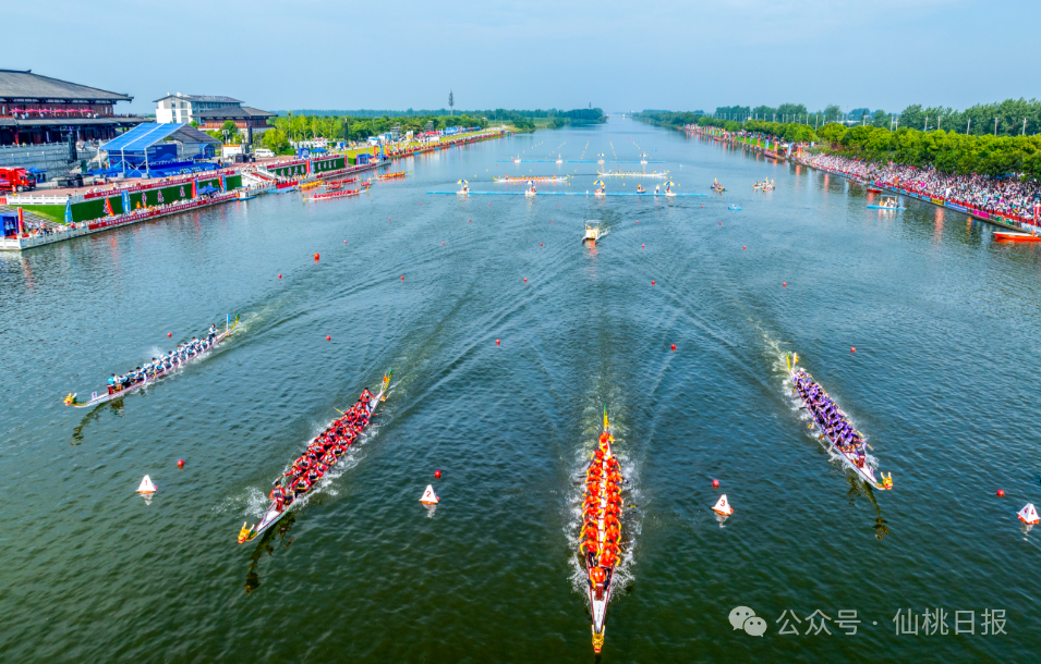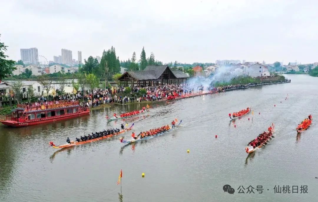 全运会龙舟比赛首次来到仙桃,也是十五运决赛举办城市之外唯一承办龙舟赛的城市。中国龙舟公开赛是连续第三次来到仙桃。仙桃龙舟赛的赛场设施、环境,赛事组织、氛围,美丽宜人的田园风景独具魅力。 而6月2日,离赛场10多公里之外的干河街道袁市村,河上鼓声阵阵,龙舟劈浪;河岸呐喊声声,笑语飞扬。一场“粽情端午 龙腾袁市”龙舟邀请赛正在这里激情上演。9支队伍、两项竞速、热情似火的观众,把水乡端午烘托得红红火火。端午赛龙舟,再现袁市“沔阳小汉口”的繁华胜景。