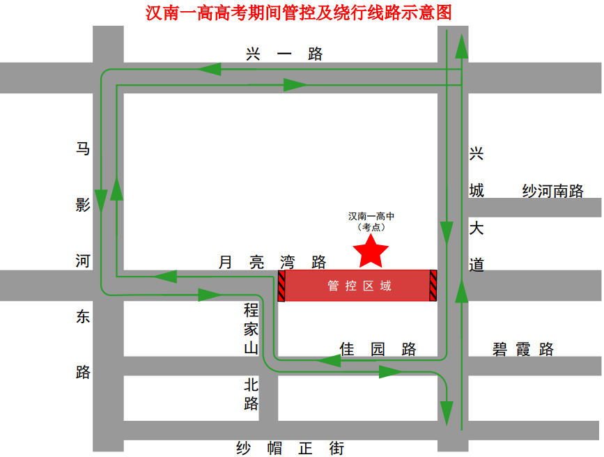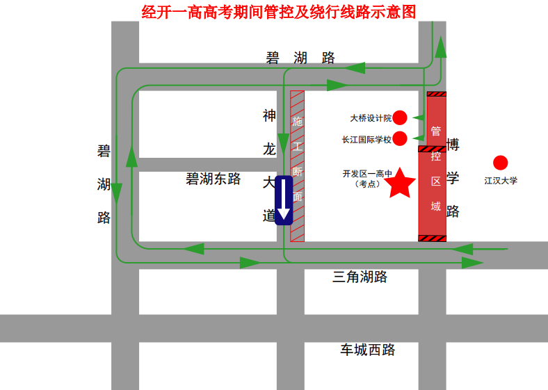 管控措施:考试当日上午7:30至考试结束、下午开考前90分钟至考试结束,博学路碧湖路至三角湖路段禁止机动车辆通行、停放及鸣喇叭。送考车辆停放在管制区域以外的三角湖路、碧湖路等周边道路和区域,需行经该路段的车辆绕行碧湖路、神龙大道、三角湖路等相关路段。