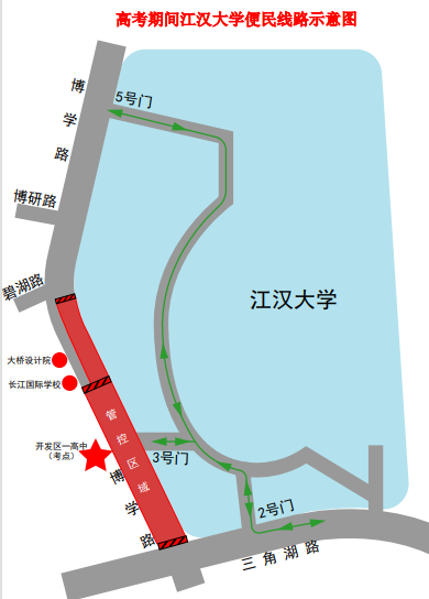 便民举措:前往武汉经开区第一中学考点的送考私家车可以凭借考生准考证,从江汉大学2号门或5号门进入校园,并将车辆停放至江汉大学3号门周边区域。考生只需横过博学路即可到达考点。