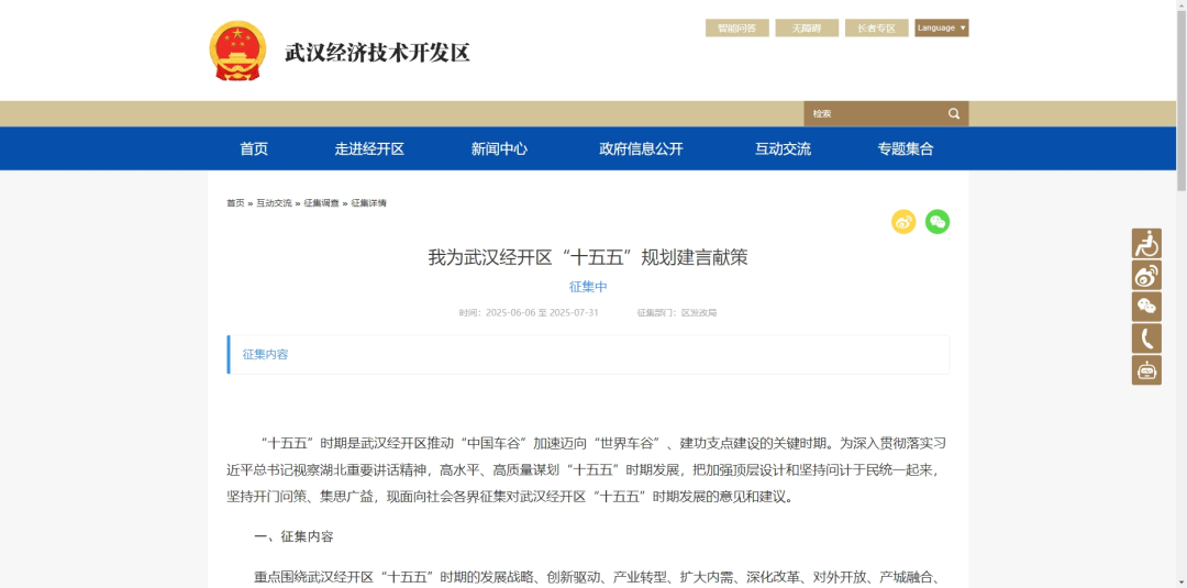 重点围绕武汉经开区“十五五”时期的发展战略、创新驱动、产业转型、扩大内需、深化改革、对外开放、产城融合、绿色低碳、安全保障、社会治理、民主法治、党的建设等方面广泛征集社会各界意见建议。对社会各界人士提出的意见和建议,我们将组织专门力量进行认真研究和吸纳,作为编制武汉经开区“十五五”规划的重要参考。