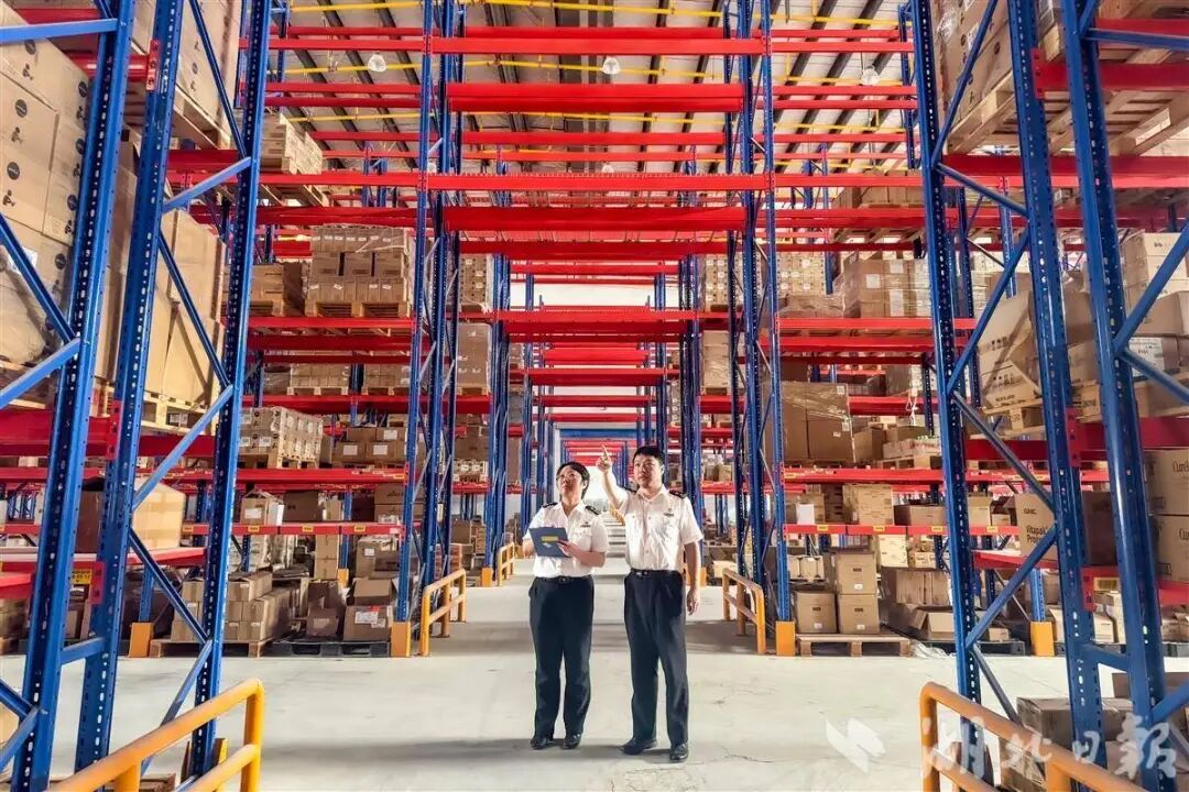 ▲汉阳海关关员在跨境电商保税仓内进行监管作业。
