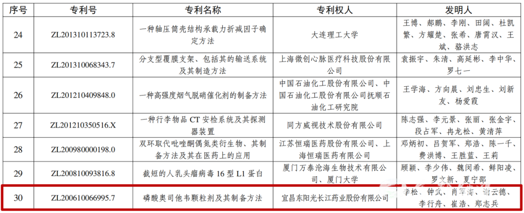 6月5日,国家知识产权局公开发布《国家知识产权局关于第二十五届中国专利奖授奖的决定》,宜昌东阳光长江药业股份有限公司的发明专利“磷酸奥司他韦颗粒剂及其制备方法”获得中国专利金奖,发明人是李松、钟武、肖军海、谢云德、李行舟、崔浩、郑志兵。