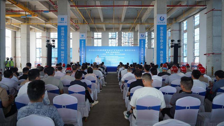 今年6月是第24个全国“安全生产月”,主题为“人人讲安全、个个会应急——查找身边安全隐患”。6月5日,武汉市2025年建筑领域“安全生产月”启动仪式(经开区分会场)暨施工现场观摩会在华中智能飞行器产业基地一期项目现场举行。全区房建项目的建设单位、监理单位和施工单位代表220余人参加活动。