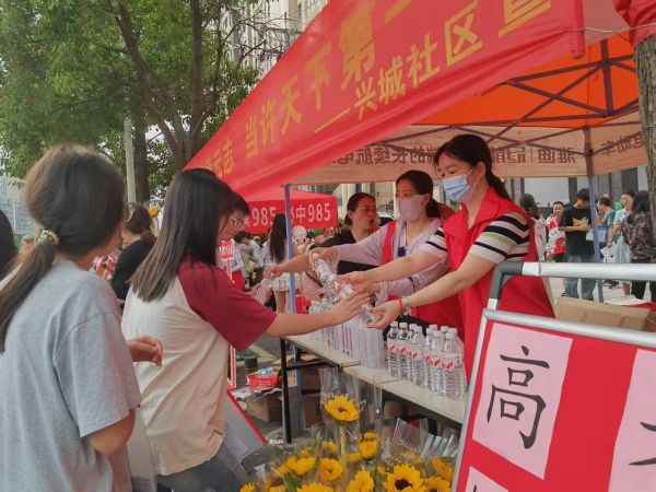在汉南一中考点外,兴城社区设立“爱心助考服务点”,配备矿泉水、文具套装、防暑药品等物资,为考生和家长提供便利。