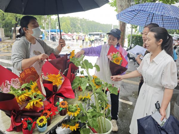 高考当日,考点外向日葵绚烂绽放,经过“锋渡益行站”摊位的家长纷纷驻足。社工将象征着希望与阳光的向日葵送到大家手中,并送上温暖祝福。家长接过向日葵,脸上满是惊喜与感动,得知花朵来历后,不禁感叹:“原来我们辖区藏着这么温暖的残疾人服务机构!”纷纷竖起大拇指。