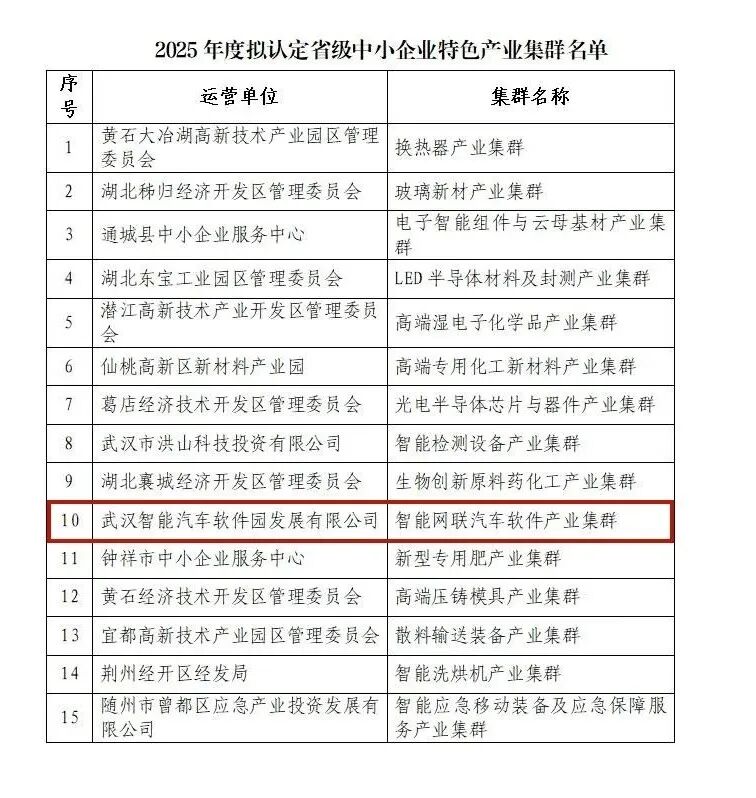 车谷融媒6月10日讯 近日,湖北省经信厅公示2025年度省级中小企业特色产业集群名单。武汉经开区智能网联汽车软件产业集群入选,是武汉市上榜的2家产业集群之一。