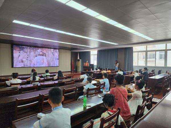 活动伊始,孩子们身着精美的汉服,带着好奇与憧憬踏入了传统文化的奇妙世界。社工老师通过生动有趣的讲解、丰富多彩的图片和视频资料,为孩子们详细介绍了洛阳独特的地理环境与自然风貌。龙门石窟的佛像庄严肃穆,诉说着千年的历史沧桑;白马寺的钟声悠扬回荡,传递着佛教文化的博大精深;洛阳牡丹的娇艳欲滴,展现着“花中之王”的雍容华贵。而那热闹非凡的洛阳庙会、精彩绝伦的河洛大鼓等民俗文化,更是让孩子们沉浸其中,领略到了传统文化的独特魅力。