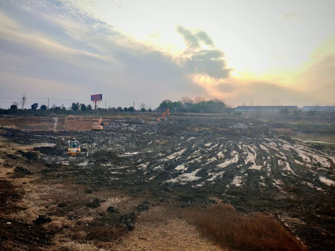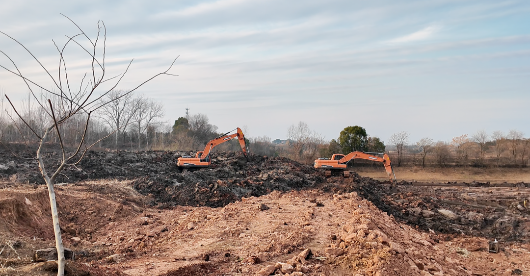 两台大型挖掘机正在对泗水桥村新扩挖的塘堰进行最后清理 图片来源:东宝区水利和湖泊局
