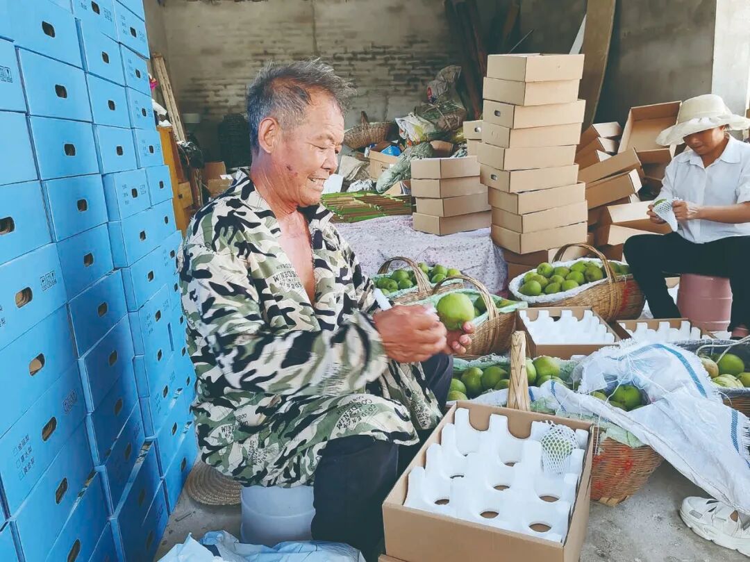 话不多说,折纸盒、装箱、打包……她们干得热火朝天。下午4点,当天采摘的梨子全部包装完,第二天这些鲜梨就能送到广州客户的手上。