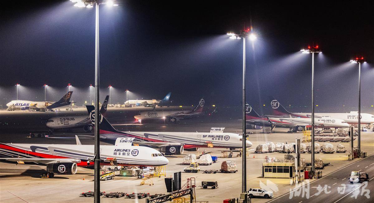 凌晨,鄂州花湖国际机场停机坪,全货机依次排开,运输货物的拖车穿梭往来。(湖北日报全媒记者 薛婷 摄)