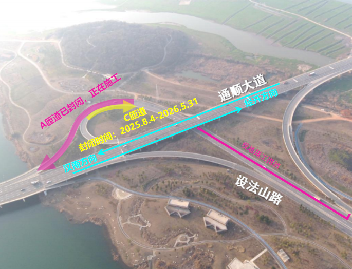 项目施工涉及设法山立交A、C两条匝道,采取分段全封闭方式推进。目前,军山新城北环线设法山A匝道(设法山路往通顺大道汉南方向)已实施封闭施工;C匝道(通顺大道北往设法山路春笋方向)计划于2025年8月4日夜间至2026年5月31日起封闭。