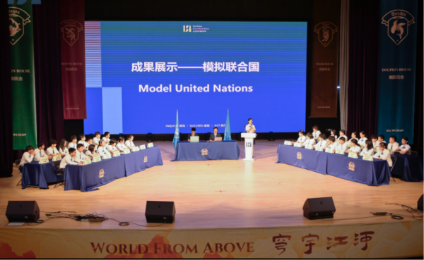 在成果汇报仪式的聚光灯下,模拟联合国(MUN) 环节无疑掀起了全场高潮。聚焦关乎人类命运的紧迫议题——“全球气候变化框架公约”,爱莎学子们化身“外交官”,模拟各国代表与国际组织官员,以卓越的英语表达能力、深邃的全球视野和娴熟的外交谈判技巧,为现场观众呈现了一场思想激荡、扣人心弦的“国际峰会”。学子们以精准、流利的英文进行陈述,其逻辑之缜密、表达之自信,令在场家长与嘉宾频频颔首赞叹,仿佛置身于真实的联合国会场。