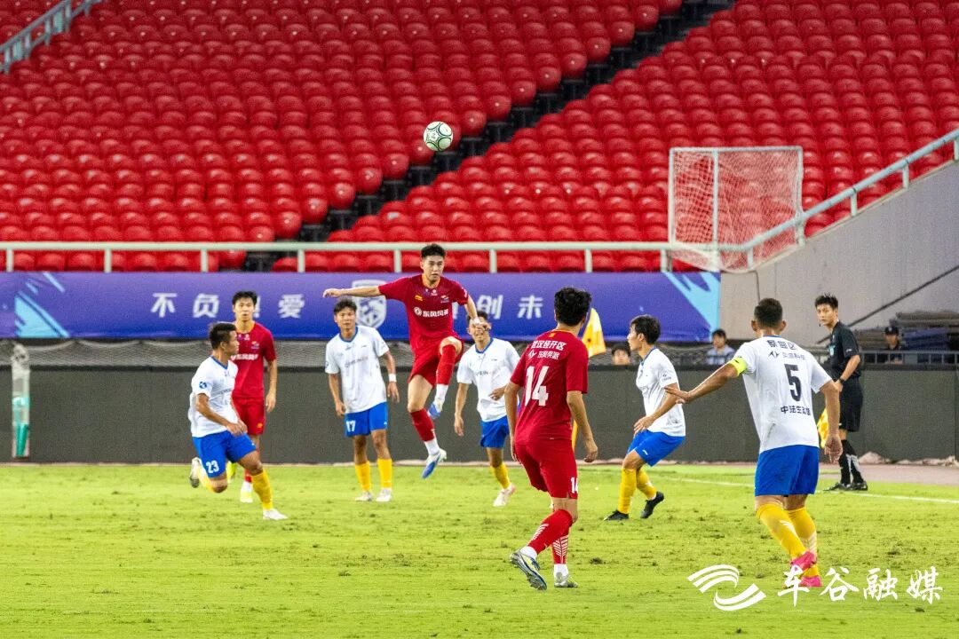 晚上7:30,比赛正式开赛。看台上,经开队球迷挥舞旗帜、敲响战鼓,齐声呐喊“经开必胜”。球场上,经开队身着红色球衣,踏着球迷的鼓点,化身红色巨浪,潮水一样冲击蔡甸队的防线。开赛后40分钟,经开队5号球员陈志威率先破门,以1:0结束上半场争夺。