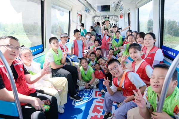 午后,研学队伍转场武汉光谷空轨,开启“空中看科创”的独特体验。随着270°全景空轨从九峰山站缓缓驶出,孩子们透过车窗俯瞰光谷科创走廊的风貌。“大家看,空轨的轨道在上方,列车通过悬挂装置‘挂’在轨道上,这种设计能节省地面空间!”志愿者老师结合沿途风景,用通俗的语言讲解悬挂单轨技术原理,并抛出“如果让你设计未来交通工具,会加入哪些功能”的趣味问题,孩子们纷纷举手分享创意,有的说“要能飞”,有的说“要环保节能”,奇思妙想在车厢内碰撞。