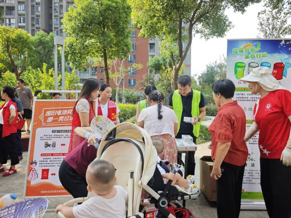 另一边的垃圾分类宣传区也很热闹。工作人员拿实物举例,通过互动问答教大家垃圾分类知识。“原来纽扣电池是有害垃圾,这下终于懂了!”一位阿姨听完讲解,恍然大悟。互动问答区里,居民你一句我一句讨论,笑着就把垃圾分类要领记住了。