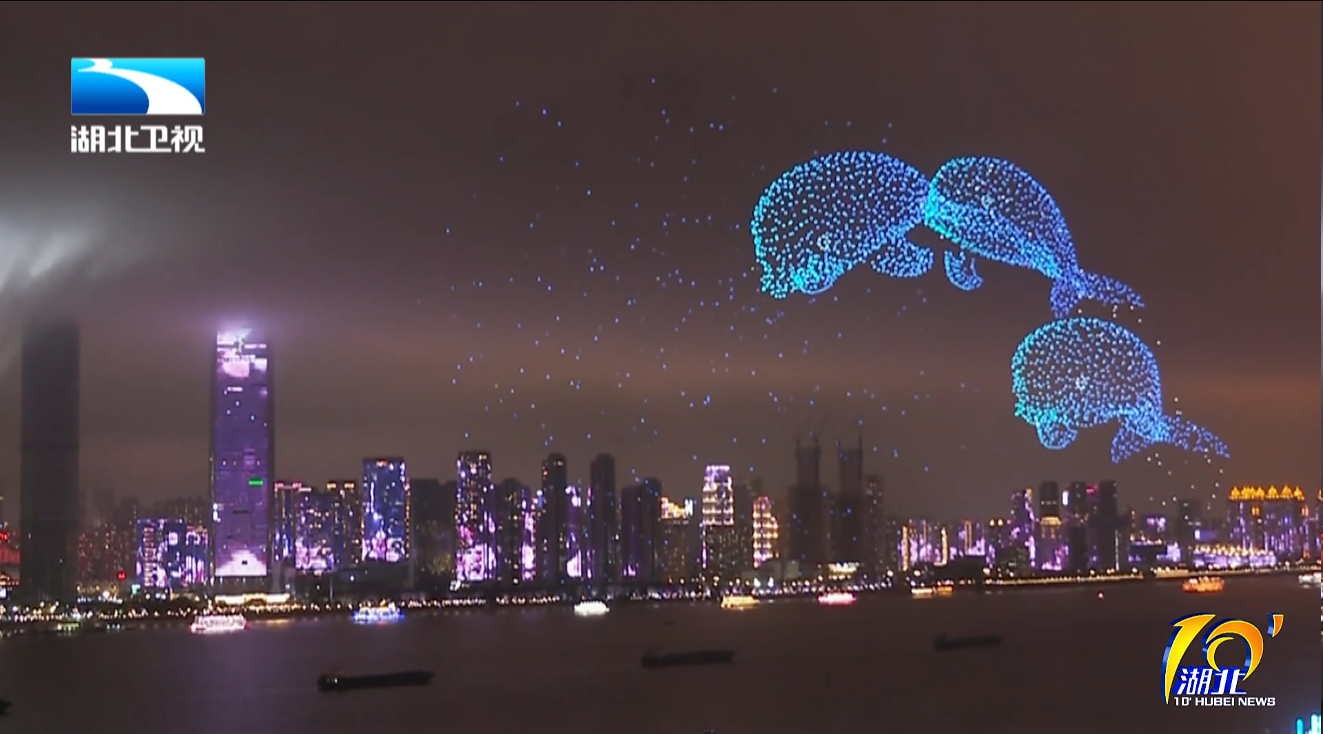 记者 赵黎黎:哇!无人机亮灯的一刻我在现场听到非常热烈的欢呼声,此刻在长江上空中我们首先看到的是今天的特别来宾——长江江豚,它们一家三口正在“江面”翻腾起舞。此刻,无人机搭载爆闪新科技,让江水化作星河,好似江豚飞跃浪漫星空,寓意着滚滚长江之水从遥远走来,向未来奔去的浩浩声势。