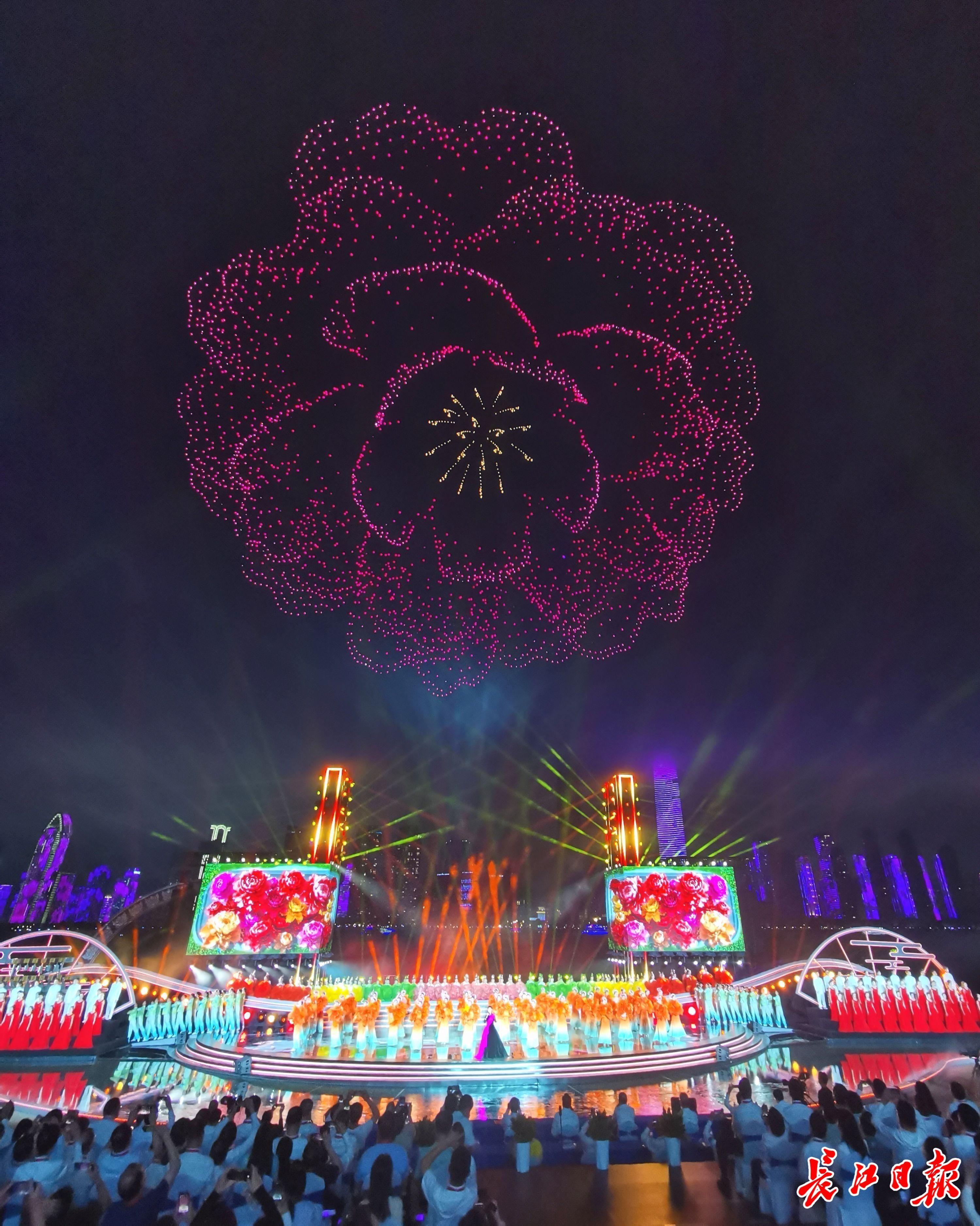 9月12日晚,2025长江文化艺术季开幕式在汉口江滩三阳广场及长江水域举行,融文艺演出、绚烂烟花、灯光秀、无人机编队表演于一体。 记者高勇 摄