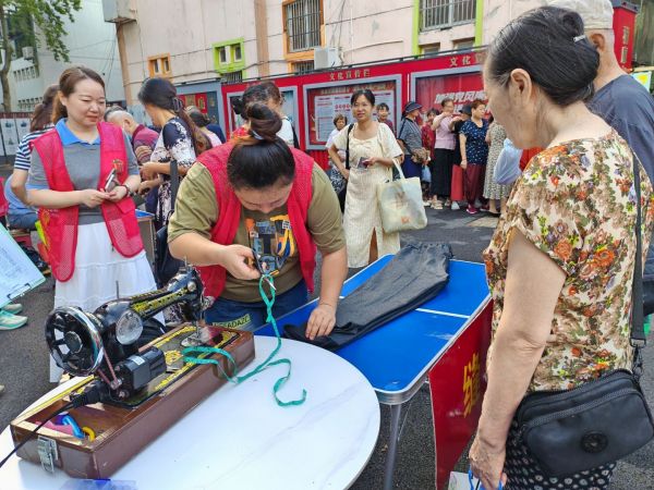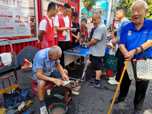 活动现场,各个便民服务区域前排起了长队。缝纫摊位前,居民们纷纷拿着需要修补的衣物,与缝纫师傅亲切交流修补细节。师傅们飞针走线,不一会儿,破损的衣物便重焕生机;修伞修鞋处,师傅们全神贯注,手中的工具上下翻飞,损坏的伞具和鞋子在他们的巧手下逐渐恢复“健康”;理发摊位前,理发师手法娴熟,根据居民的需求精心修剪发型。理完发的居民对着镜子,看着焕然一新的自己,脸上露出满意的笑容,还不忘对理发师竖起大拇指;磨刀摊位前也排起了小队伍,居民们拿着钝了的刀具,耐心等待师傅打磨。随着“嚓嚓”的磨刀声,刀具逐渐变得锋利,居民们的心也暖了起来。