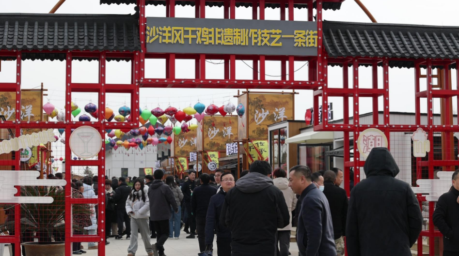 今年1月9日,正值荆荆高铁通车满月,沙洋风干鸡非遗制作技艺一条街开街仪式暨“风味沙洋 遇见高铁”2025年电商直播活动,在荆荆高铁沙洋西站站前广场举行。