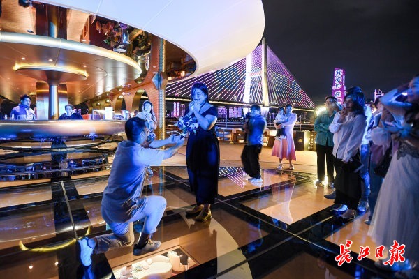 “我们俩都不是武汉本地人,却在这座城市找到了归属与彼此。今年,我们决定领证了,在武汉筑起我们的小家,从这里开始,把未来的日子过得有滋有味、热气腾腾。”徐乾激动地说。他和郭维因为工作相识,而今在武汉已相恋5年。这是“江上告白”互动体验首次亮相“古琴号”,不仅是恋人之间的告白,更是对城市的告白。郭维说,夜游长江的体验非常丰富,“老家有朋友来武汉,我们都会带他们来游船。这5年,武汉在不断更新,更好玩、更迷人”。